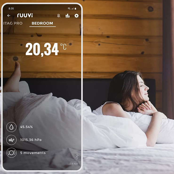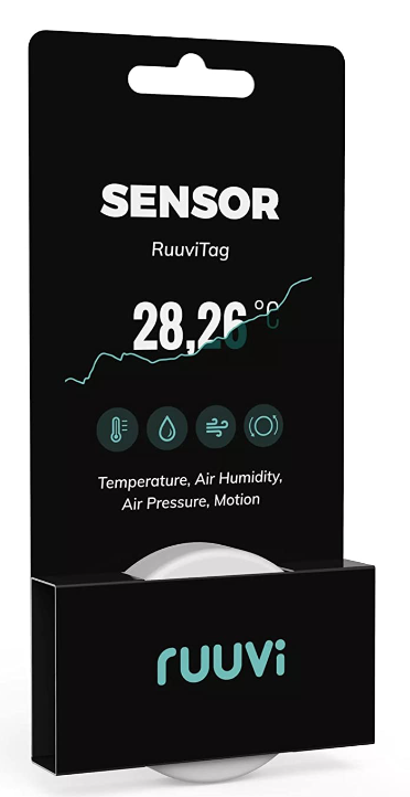 RuuviTag 4in1 Wireless Bluetooth Temperature, Air Humidity, Air Pressure, and Motion Bluetooth Sensor. Free app for Android and iOS. Made in Europe.